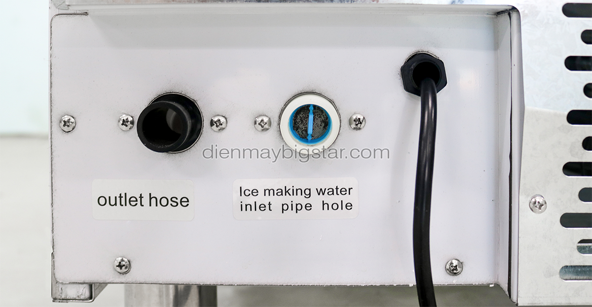 Phía sau máy được trang bị van cấp và xả nước tự đọng, đảm bảo nguồn nước luôn sẵn sàng cho chu trình làm đá khép kín. Thiết kế này giúp việc vệ sinh máy, loại bỏ nước thừa, cặn bẩn nhanh chóng và tiện lợi.
