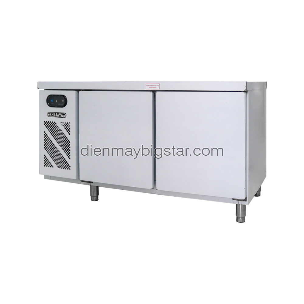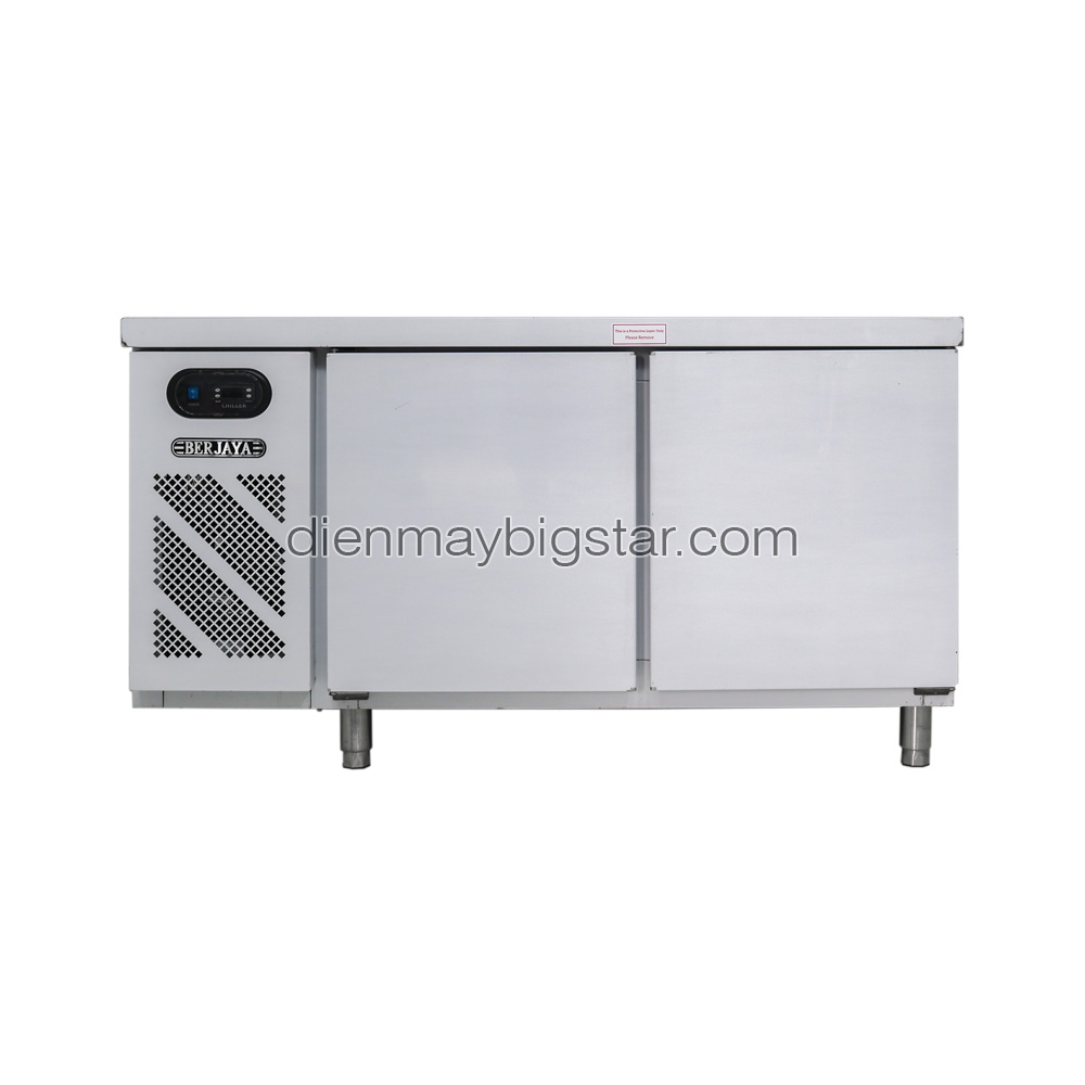Bàn mát Berjaya có thể tích 385 lít với 2 cánh dài 1.5m. Rất thuận tiện để lắp đặt và dự trữ thịt, cá, rau củ,… trong các bếp nhà hàng.
