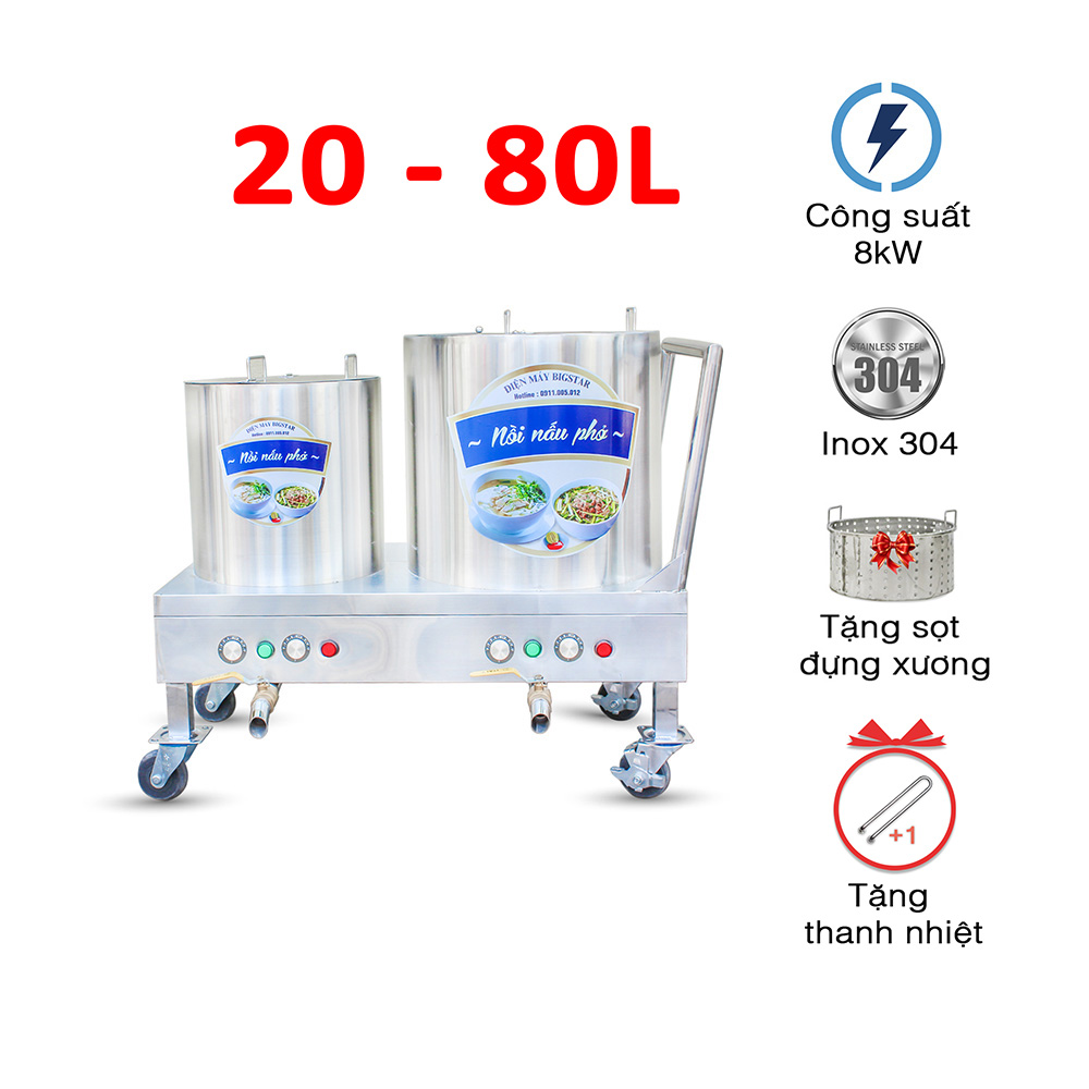 Bộ nồi nấu phở điện 20-80L của Điện máy BIGSTAR được sản xuất và thiết kế theo công nghệ hiện đại. Đây là sản phẩm chuyên dùng để trụng phở, nấu nước dùng hoặc trần bún, hủ tiếu,…vv. Nồi nấu phở 20-80L có bánh xe đun nấu tự động hoàn toàn, sạch sẽ, không khói và bụi tro. Thiết bị phù hợp với hầu hết các quán ăn, quán phở, quán bún lớn nhỏ,…vv.