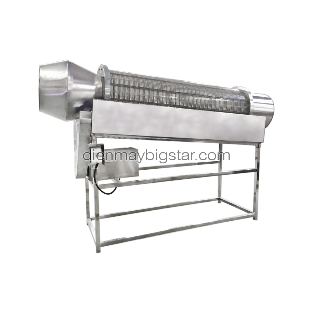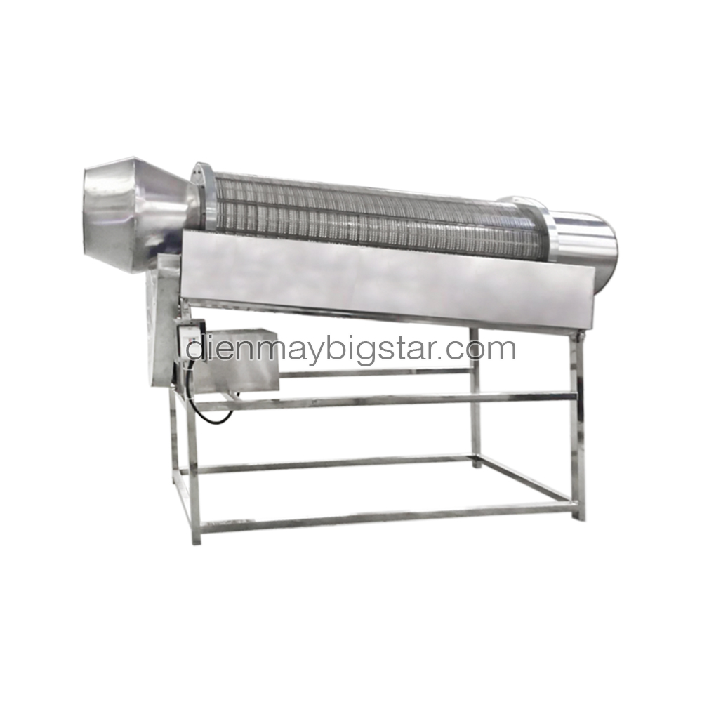 + Cửa ra nguyên liệu bố trí cuối máy, nơi cho thành phẩm đậu hà lan đã sạch sơ, phần sợi xơ được thu tách sẽ thoát ra các mắt lưới trên khoang để gom thải.