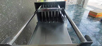 Điểm khác biệt là nếu máy cắt đá 5 lưỡi mẫu cũ bạn phải đẩy thanh kéo 3 lần để cắt đá ra phía trước. Thì với máy cắt đá 5 lưỡi mẫu mới được nâng cấp, bạn chỉ cần đẩy thanh kéo 2 lần là đá sẽ ra phía sau. Sau khi cắt xong, các khối đá nhỏ sẽ tự động đi qua rãnh và rơi xuống. Việc của bạn đơn giản là dùng dụng cụ hứng đá dưới rãnh thoát đá là xong.