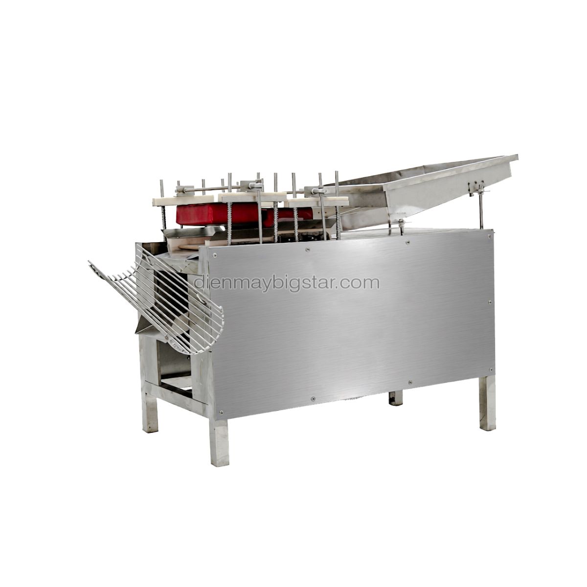 Phễu cấp liệu của máy là có thiết kế hơi nghiêng giúp trứng sau khi cho vào có thể trượt tự động vào nơi bóc vỏ trứng dễ dàng. Phễu nạp liệu cũng được thiết kế với kích thước lớn giúp người dùng có thể bỏ một lúc rất nhiều trứng, tiết kiệm thời gian và công sức hơn.