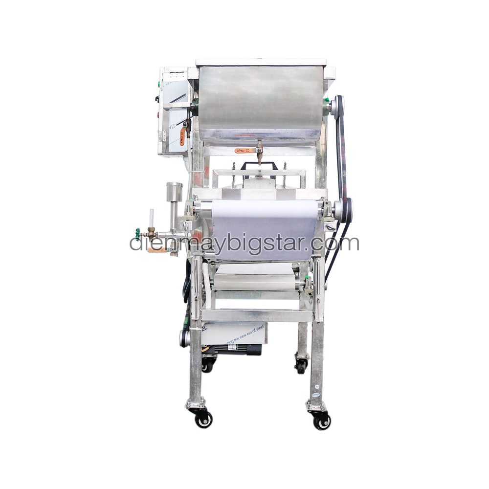 + Bánh sẽ từ từ được tráng mỏng và hấp chín khi đi qua khoang hấp, sau đó cắt thành các lá bánh có kích thước đều nhau. Bạn chỉ cần ngồi lấy bánh thành phẩm xếp vào khay hoặc cuốn thêm nhân vào.