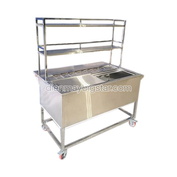 Thùng Inox đựng đá có khay topping và kệ trên được Điện máy BigStar trực tiếp gia công sản xuất, chuyên dùng cho các quán trà sữa, quán cafe, quán thức ăn nhanh, nhà hàng,… Thiết bị mang đến sự thuận tiện trong việc sử dụng với thùng chứa đá dung tích lớn, giúp giữ lạnh lâu, bên trên là các khay đựng topping giúp trang trí, bổ sung cho thức uống thêm phần hấp dẫn. Qua đó, giữ không gian buôn bán luôn gọn gàng, sạch sẽ, gây ấn tượng tốt trong mắt thực khách, nâng cao tính chuyên nghiệp cho cơ sở kinh doanh.