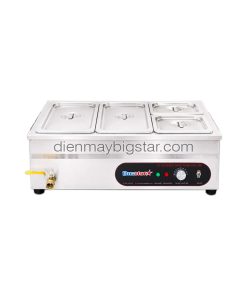 Tủ hâm nóng thức ăn 4 khay được trang bị 2 khay inox GN 1/3 và 2 khay GN 1/6, cho phép người dùng linh hoạt trưng bày nhiều món ăn khác nhau. Thiết bị hoạt động theo nguyên lý gia nhiệt cách thủy bằng hơi nước, giúp nhiệt độ lan tỏa đều khắp các khay, hạn chế tình trạng món ăn bị khô hoặc cháy đáy.