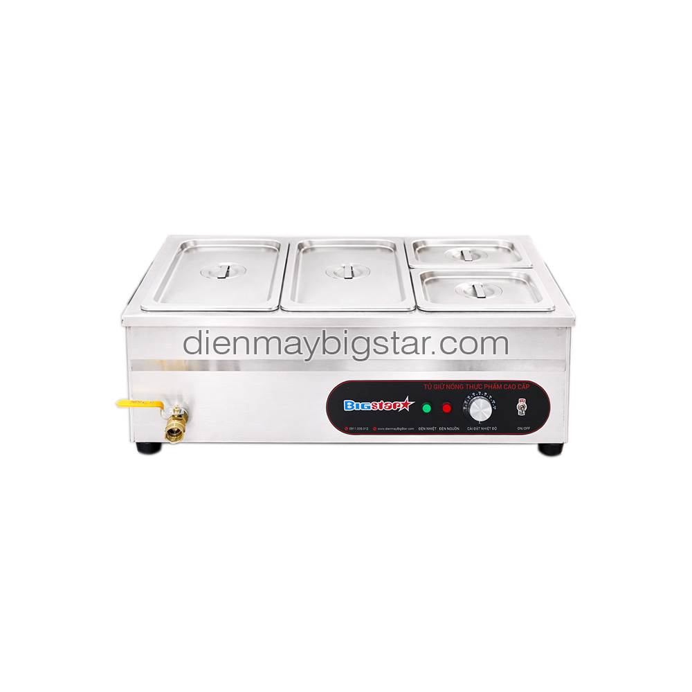 Tủ hâm nóng thức ăn 4 khay B1-2A2 là thiết bị chuyên dùng để giữ nóng thực phẩm, nhất là các món kho, xào, canh, soup, món có nhiều nước sốt và có độ ẩm cao, thường được sử dụng tại các quán ăn, quán cơm văn phòng, căn tin, quầy buffet,…