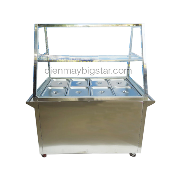 Sản phẩm được thiết kế hiện đại, đẹp mắt có dạng như một chiếc tủ kính hình thang vuông, giúp thuận tiện khi đứng bán hoặc múc thức ăn sau khi đã được hâm nóng.
