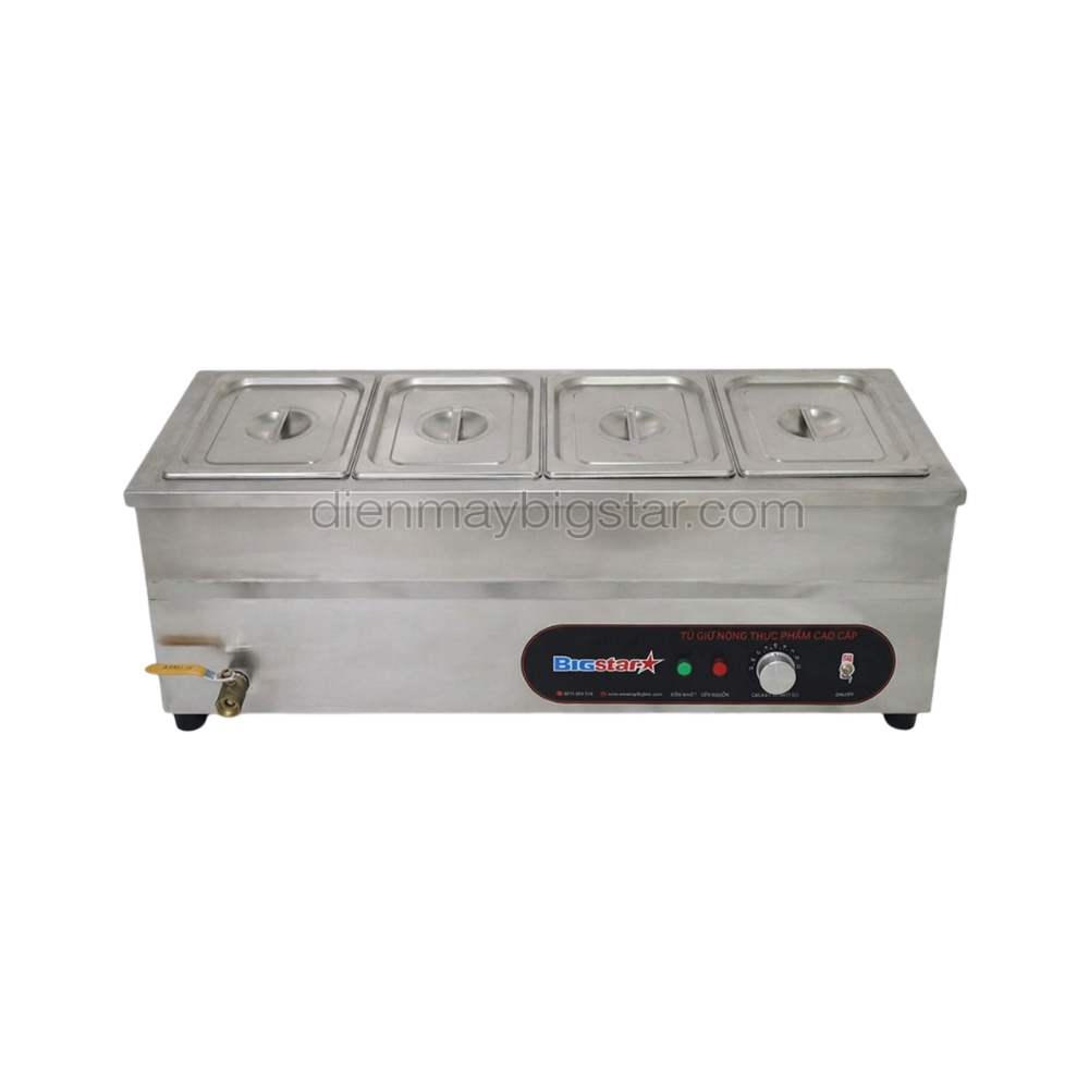 Tủ hâm nóng B4-4 sử dụng phương pháp hâm nóng cách thủy, giúp duy trì nhiệt độ ổn định mà vẫn giữ được hương vị tự nhiên của món ăn, không làm khô hay biến đổi chất lượng thực phẩm. Đây là giải pháp tối ưu cho các mô hình kinh doanh ăn uống quy mô nhỏ và vừa. Với thiết kế gọn gàng, cấu tạo bền bỉ và khả năng giữ nhiệt ổn định, sản phẩm giúp nâng cao hiệu quả phục vụ và đảm bảo chất lượng món ăn.