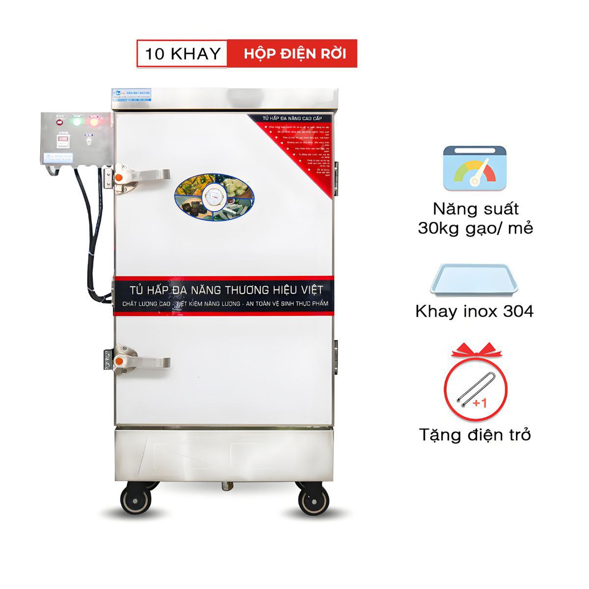 Đặc biệt, hệ thống hộp điện được thiết kế rời giúp dễ dàng thao tác và đảm bảo an toàn, tránh nguy cơ rò rỉ điện do hơi nước. Sản phẩm được làm từ chất liệu chính là inox, không chỉ bền bỉ mà còn đảm bảo vệ sinh an toàn thực phẩm, là lựa chọn tối ưu cho các cơ sở kinh doanh dịch vụ ăn uống quy mô lớn.
